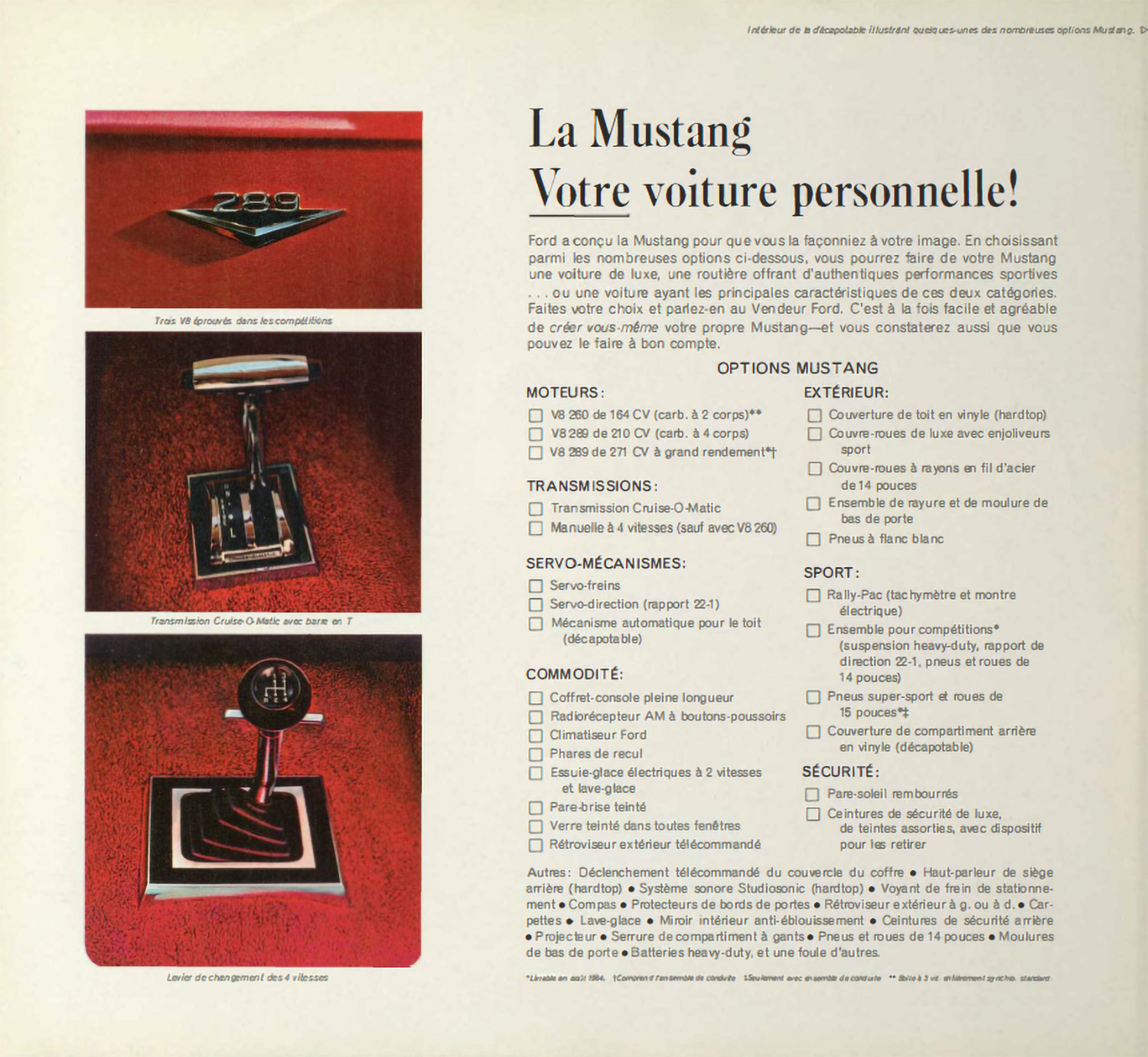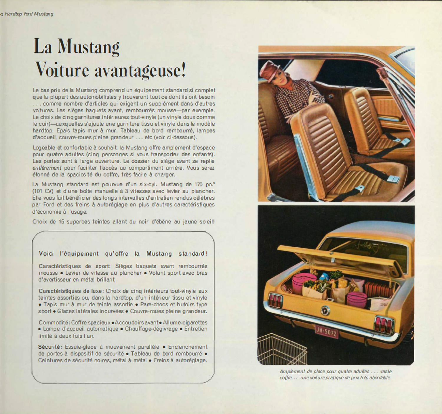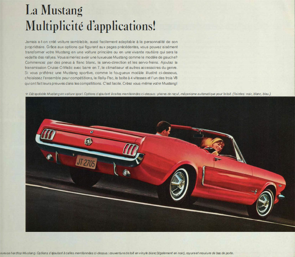 Jamais a-t-on créé voiture semblable, aussi facilement adaptable à la personnalité de son propriétaire. Grâce aux options qui figurent aux pages précédentes, vous pouvez aisément transformer votre Mustang en une voiture princière ou en une vivante routière qui sera la vedette des rallyes.